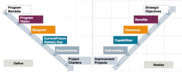 When one discusses the difference between projects and programs, the answer can be found simply by examining the expected results by which the success of each is measured. Projects are deemed successful if they produce the desired deliverables at the desired time and on budget. Programs have expectations beyond project deliverables and focus on how these deliverables are applied to realize benefits. In the end, a program’s success is measured against the effectiveness of which they deliver benefits. Programs are the mechanisms through which benefits are defined, planned and realized by organizations... a benefit is an outcome of actions or behaviors that provide utility, value, or a positive change to the intended recipient.