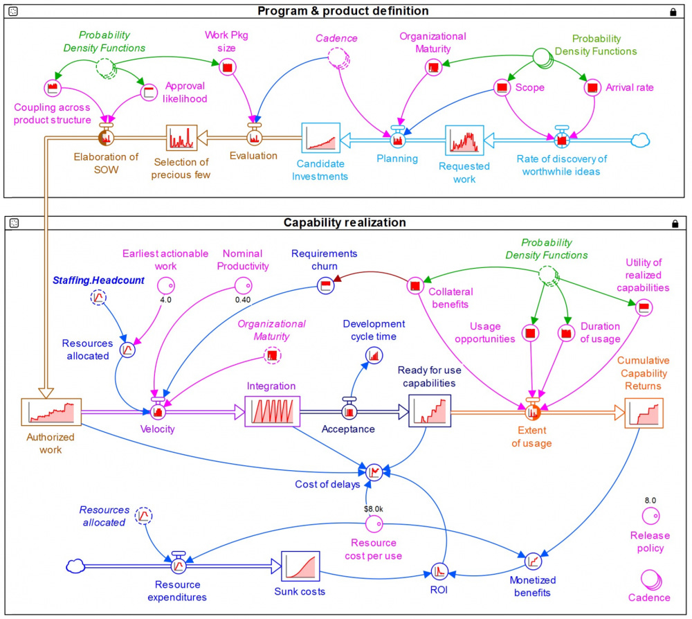 We can visualize these dynamics and related constraints by considering how this uncertainty influences the progressive delivery of value by a system. Figure 2 depicts the end-to-end flow from ‘lust to dust’, i.e. from ideas to the time-value accumulation of benefits realized, influenced by a representative set of factors (shown as circles) and boxes (depicted as stocks) over time. This diagram reflects the structure of a simulation of this flow described in more detail in this post.
