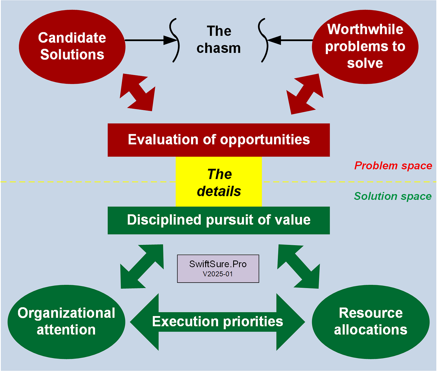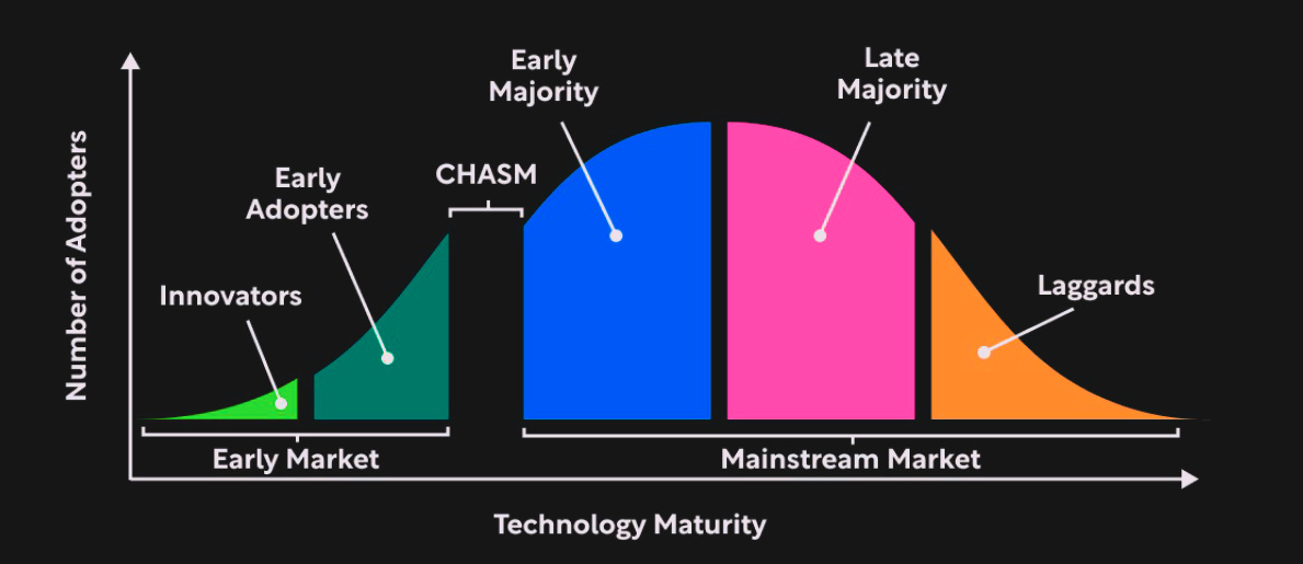 Geoffrey Moore’s “chasm” (figure 2) remains a harsh terrain between early adopters and the mainstream. Where early adopters chase novelty and technical credibility, the mainstream seeks stability and proven value. Bridging this divide demands more than marketing finesse—it requires frameworks like Ivar Jacobson’s Essence to map the hidden gaps in value perception. The irony: your solution must be credible to gain users but only gains credibility through use.