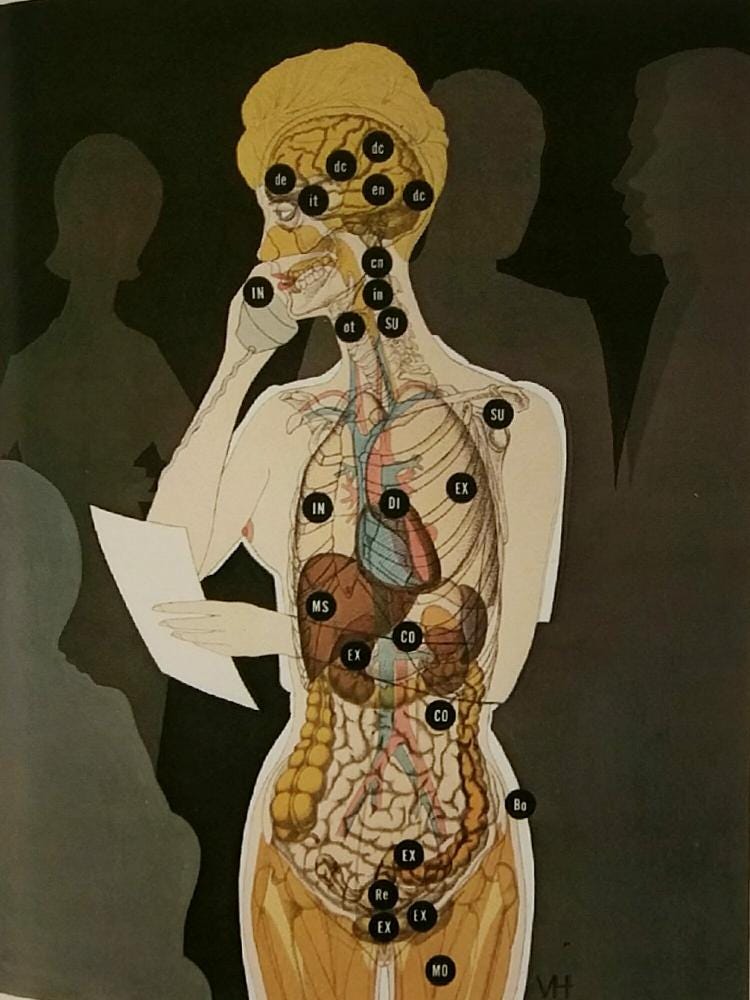 He drills into each of these subsystems as both a categorization scheme (or logical architecture) and with a specialist's love of details, revealing both the structure and processes of each subsystem. He also goes to a great deal of effort to explain key characteristics of these patterns across all levels; for example, he devotes one whole chapter (of eighty pages) to the topic of information overload, a topic essential to understanding the forces and constraints at play. He also provides a full-color plate in which he points out common characteristics of these subsystems within the level being studied (three are depicted below).