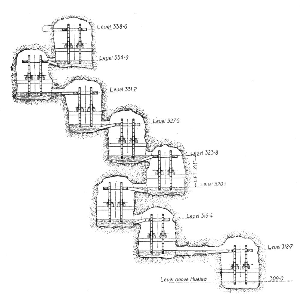 Figure 1 is a depiction of a real machine which was used around 60 A.D. for removing standing water from underground mines. These machines are known as reverse overshot water-wheels, and one of them was recovered from a copper mine at Rio Tinto in Spain and is now at the British Museum.