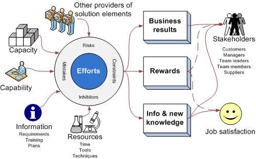 In this example, the ore is an output of a value chain. The water wheels which were used to raise water required personnel, equipment, information, and tools to realize the needed capability. The capability of a water wheel to remove this water would be determined by many factors, including the volume of water which each wheel could consume, the pace at which workers could operate the system, and the leakage which occurs across the elements of the system itself. During operation, pools of water formed at the boundaries between each processing stage performed by each wheel. The size of these pools can provide a visual indicator of the backlog of the work cells that are accomplishing that work. Such queues are inevitable in any development or production process, due to variation in the quality of requirements, the capacity of team members, and the information available to the team.