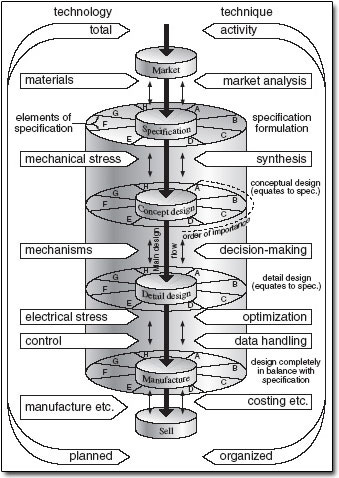 Development environments share most of the features of the water elevation system described above. In development settings, a cascading process is typically used, as depicted in Stuart Pugh's core design activity model of the interactions of technologies and technique shown in figure 2; note that in this case, the vertical flow is depicted top to bottom, unlike in the water wheels, which are subject to gravity. Each stage requires horizontal integration of the elements relevant to the structure of activities and material relevant to that stage, though the translation into wedges of activity depicted may vary by stage. The flow among team members involved in such designs can be thought of as similar to those of our cascading water elevation system.