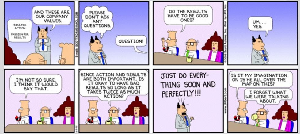 The next step in successfully performing such pivots requires defining a clear, robust, and measurable set of goals that frame the target end state and characterize the new behaviors which must be in place to realize it. Mark Pincus, the co-founder of Zynga, has said that not having clear and actionable goals can lead to death by a thousand compromises. Goals should delineate real choices made by the organization and intended to be supported by their members, rather than just regurgitating nebulous slogans without elaboration.