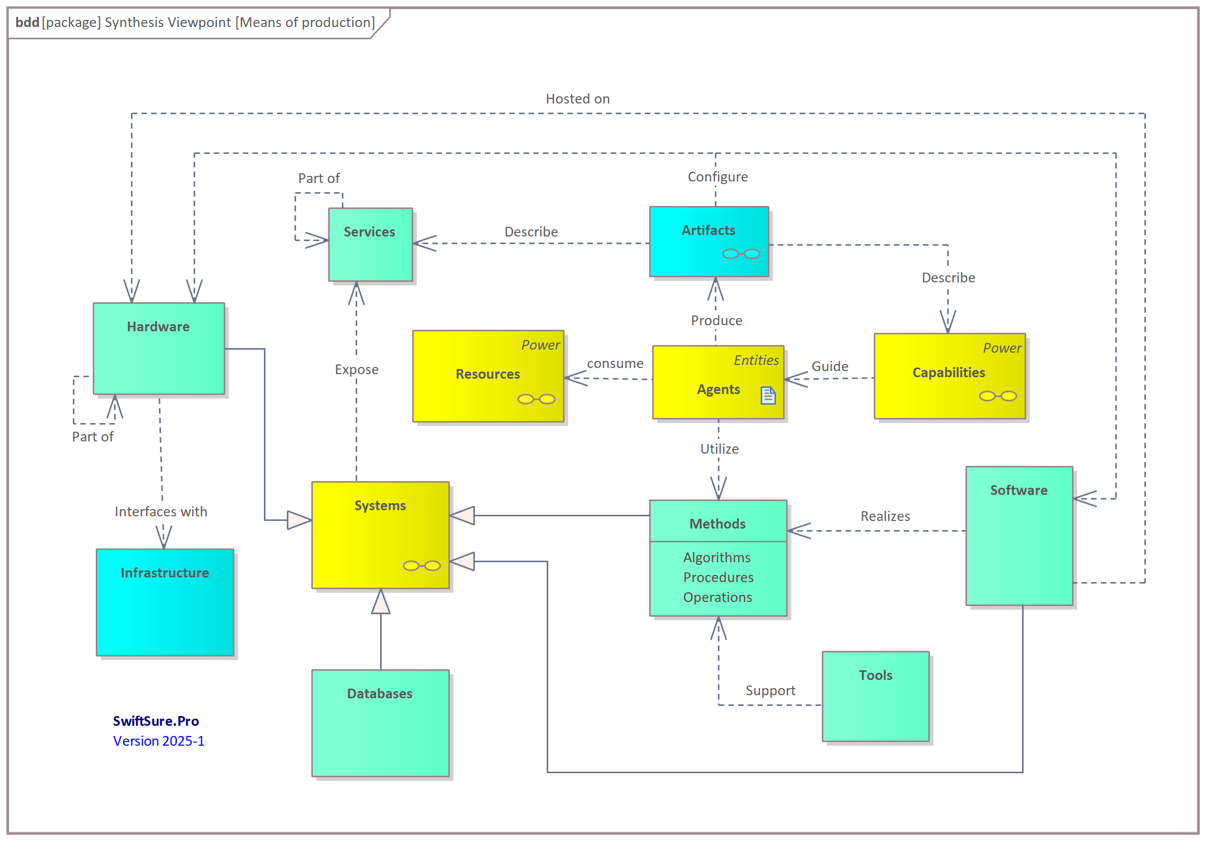 The concept of the means of production, depicted here in Figure 1, is widely used to signify the relationship between things used as inputs to a production system and the constituent mechanisms needed to provide those inputs - factories, tooling, systems, services, and methods - whether in a system of interest, or within an economy or society.
