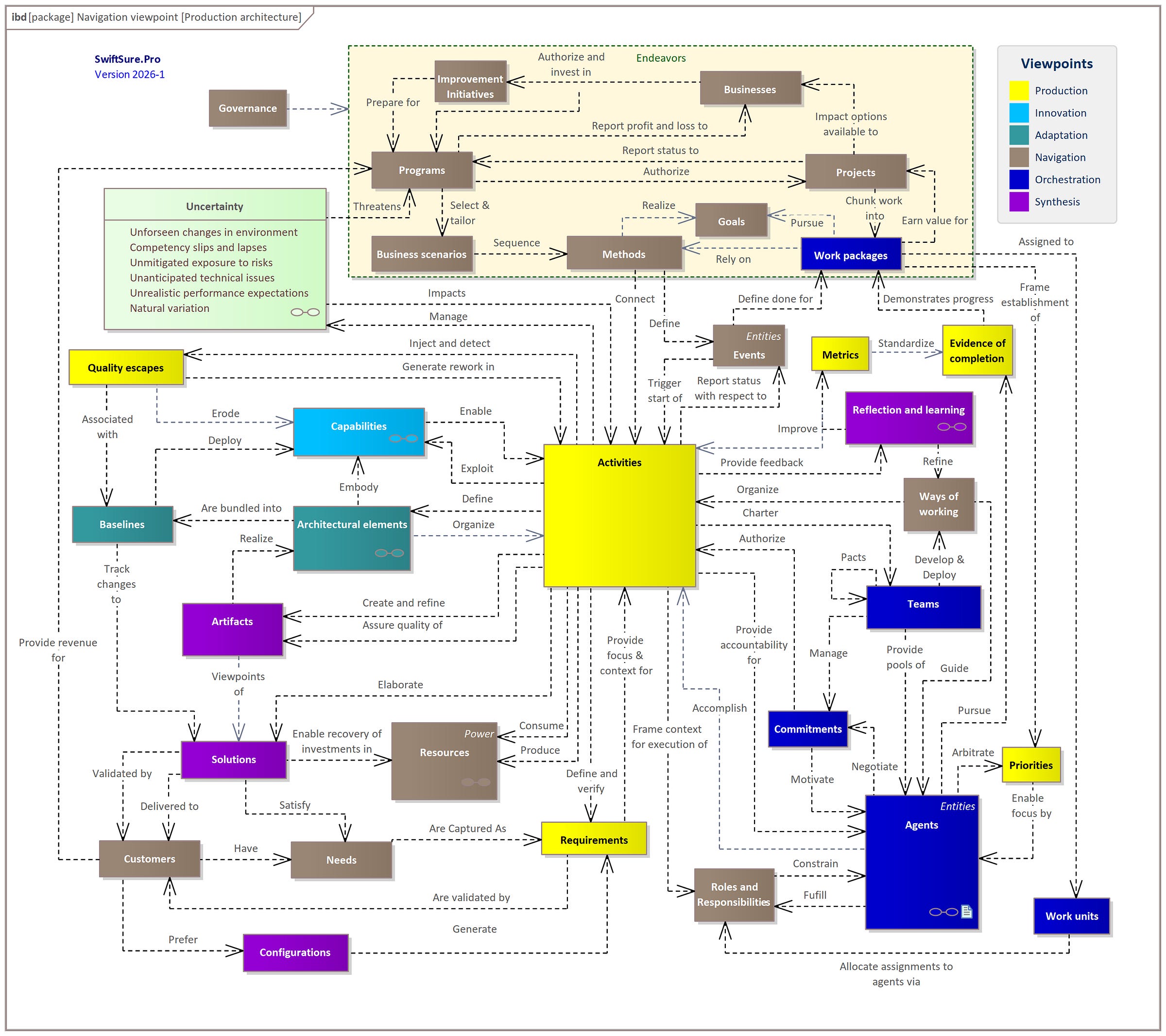 Figure 4 provides an overview of some of the entanglements necessary to integrate these viewpoints into a cohesive whole. There is no start or end to actions here, as this diagram depicts relationships, not flow. These relationships span the full range of endeavors but to keep the representation as simple as possible do not depict the competition, challenges, and constraints imposed by external environments. The dynamics introduced by those dependencies will be developed further in future posts.
