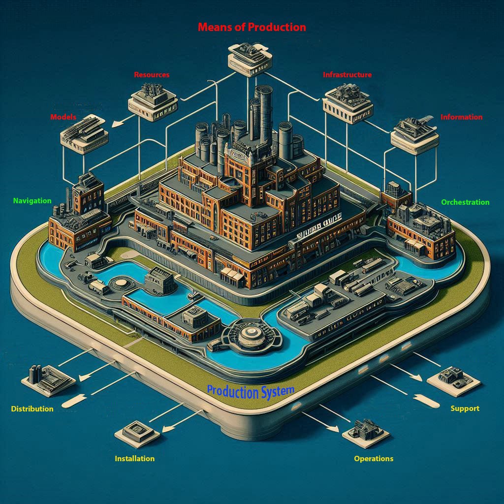 Upstream Systems: Across the top of the primary system of interest, there are several interconnected feeder lines, each themselves production systems. These stations are labeled respectively as Resources, Models, Infrastructure, and Information, and are connected to the system of interest by transportation elements that supply necessary inputs. depicting the flow of elements necessary to drive and fuel the system. The supply of the primary system of interest depends upon the adequacy of supply from these upstream systems. These collectively are often described as the Means of Production, and correspond to Elon Musk’s conceptualization of a factory as a machine:
