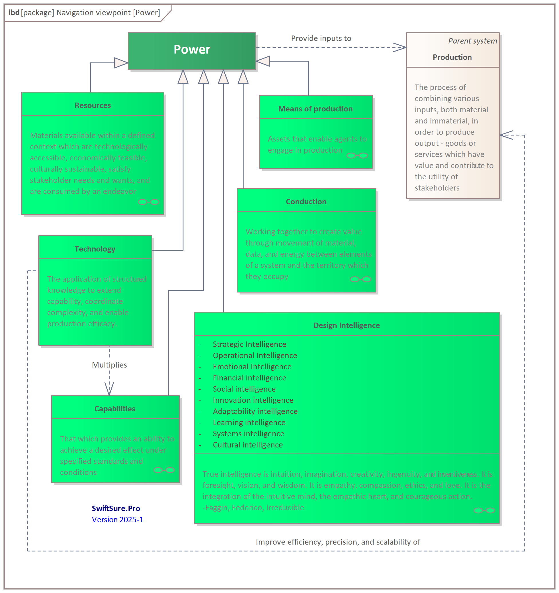 In a production process, factors of production, resources, or inputs are used to produce outputs, i.e. goods and services. There are four basic resources or factors of production: land, labor, capital, and the capability to apply these efficiently. Materials and energy are considered secondary factors in classical economics because they are derived from land, labor, and capital. These primary factors facilitate production but neither become part of the product (as with raw materials) nor become significantly transformed by the production process (as with fuel used to power machinery). In my rendering, I use a different term - power - to delineate differences from classical economics and connect to engineering concepts. In the context of production, power looks like this: