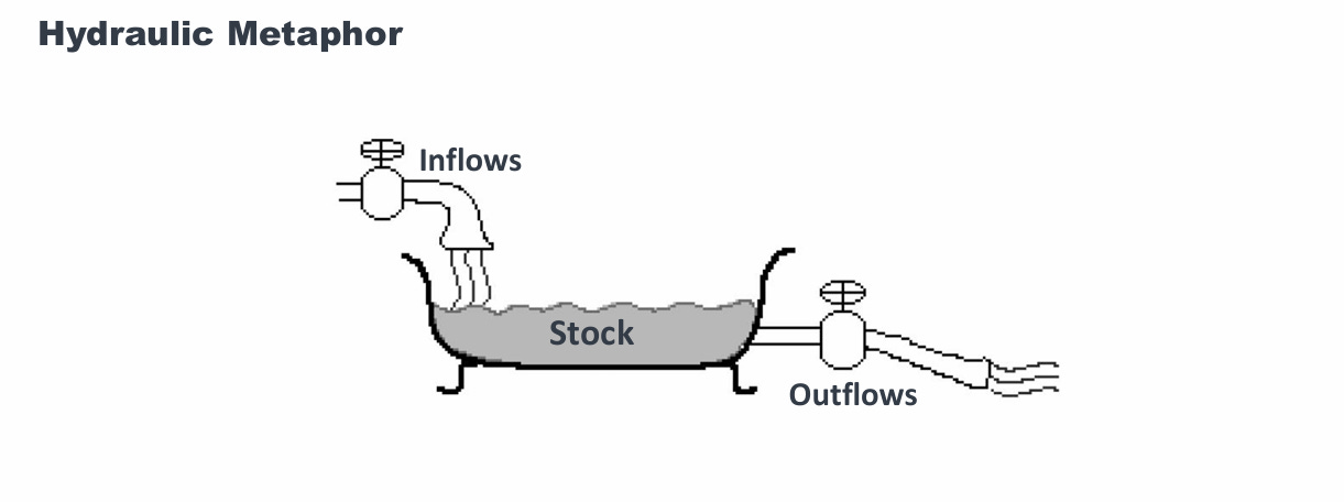This structure represents the aspects of operational costs from a lifecycle viewpoint and highlights the impacts on these costs from delays and quality escapes. To thrive within this structure, the drivers of cost from each element in Figure 3 must be actively orchestrated. This requires understanding the rate at which various kinds of work can be performed, how that evolves with time, and the longer-term consequences of short-term thinking. Planning, designing, and managing these rates are critical skills to facilitate learning and optimization. Let’s explore some examples in which stocks and flows are critical factors for production in economics.