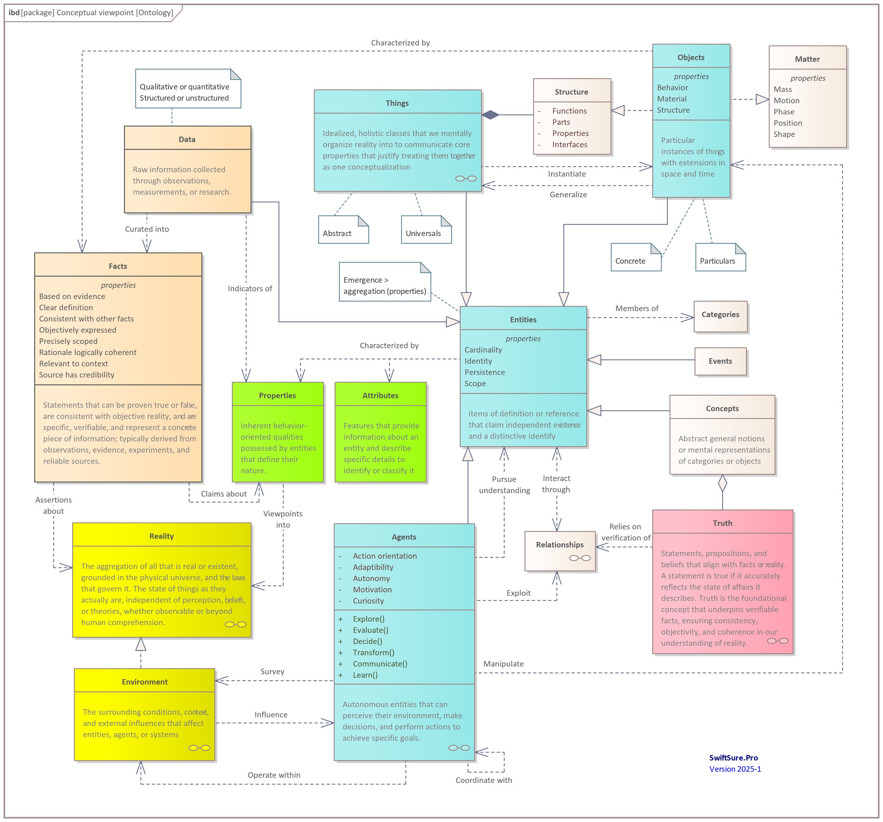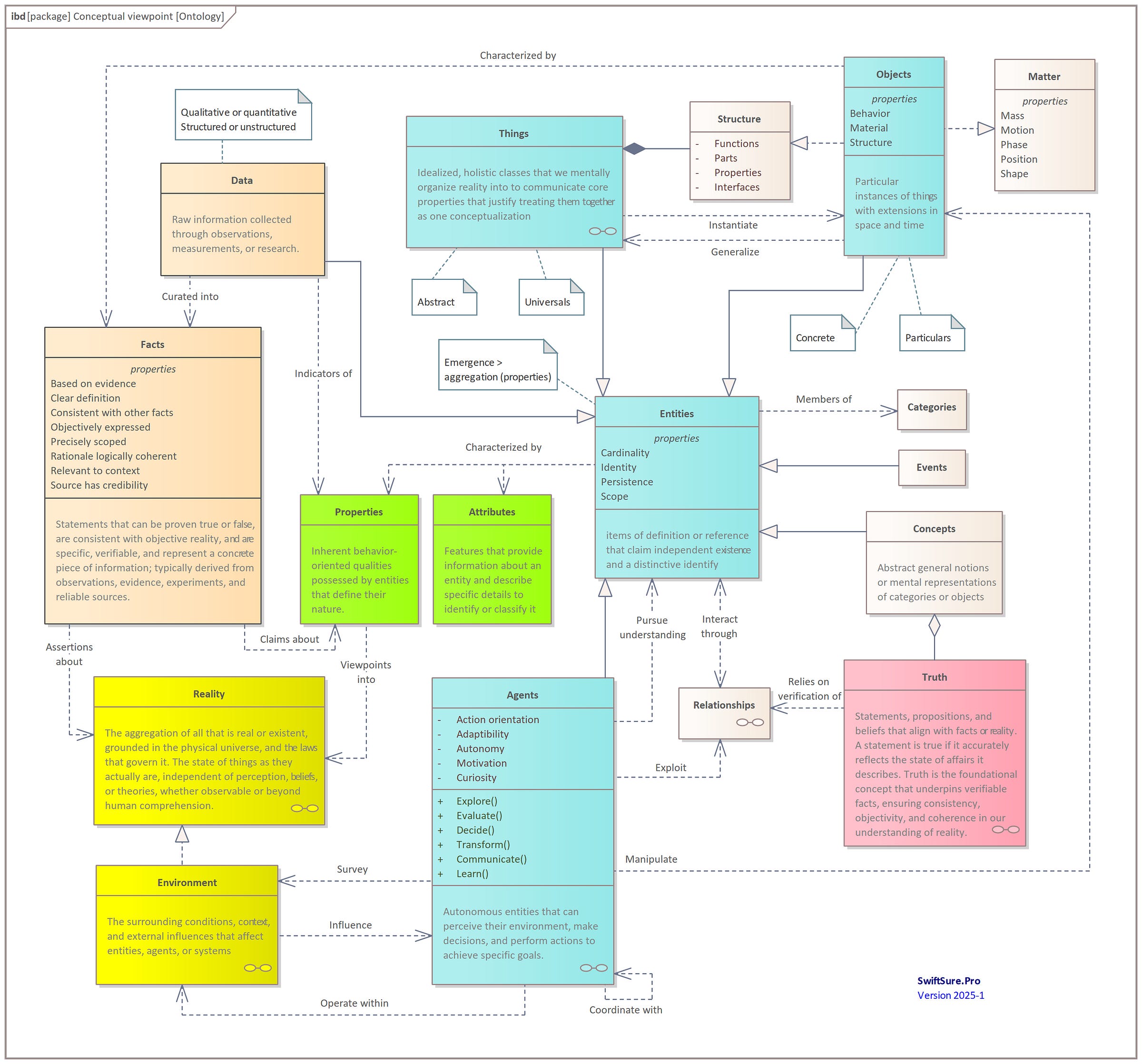 Ontologies organize elements (data, facts, entities, objects, and concepts) into a relational hierarchy, connecting how we observe, describe, interpret, and act upon the world. They facilitate precision in classification, which is especially useful in modeling real-world systems, AI reasoning, and philosophical analysis.