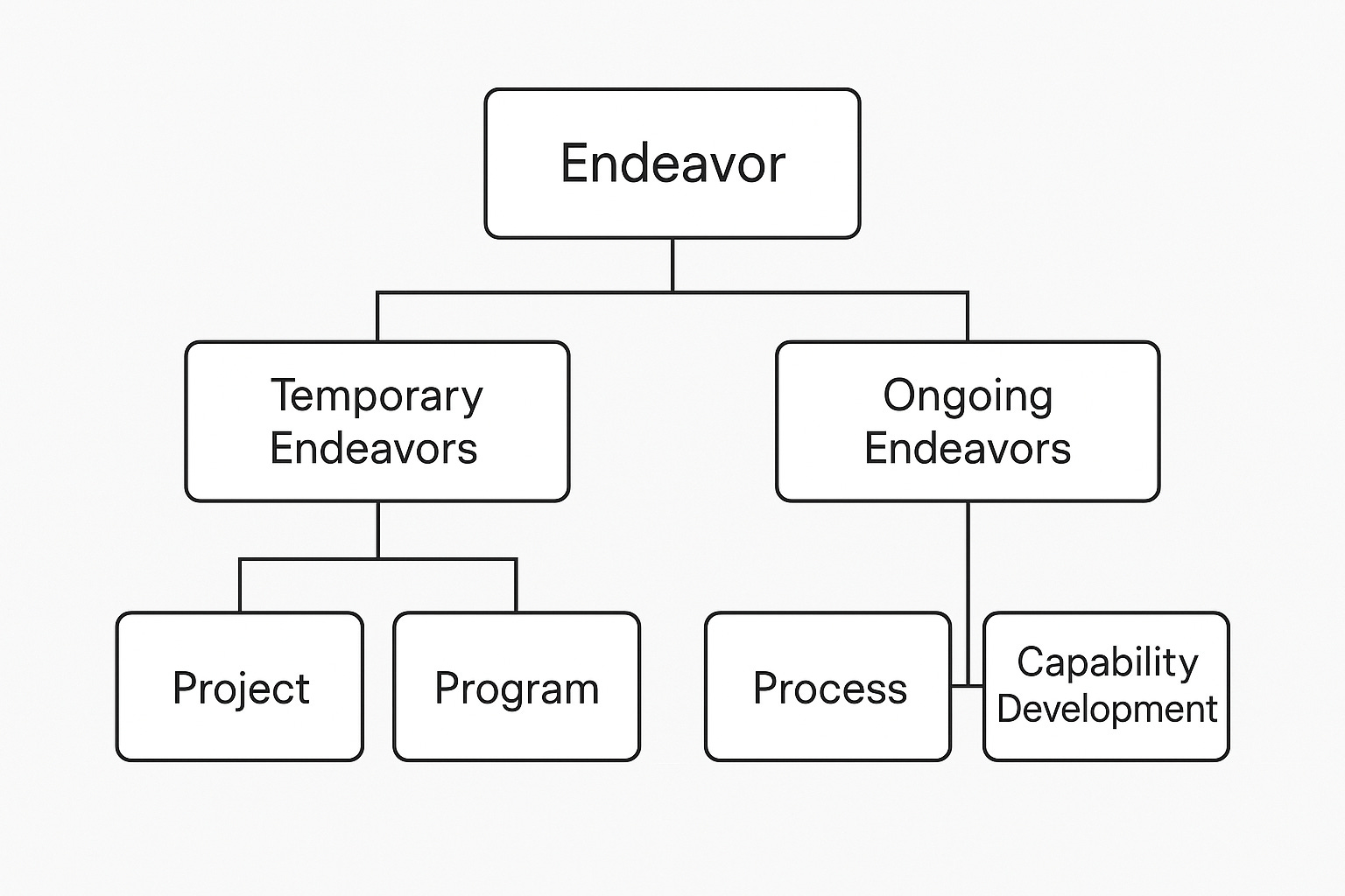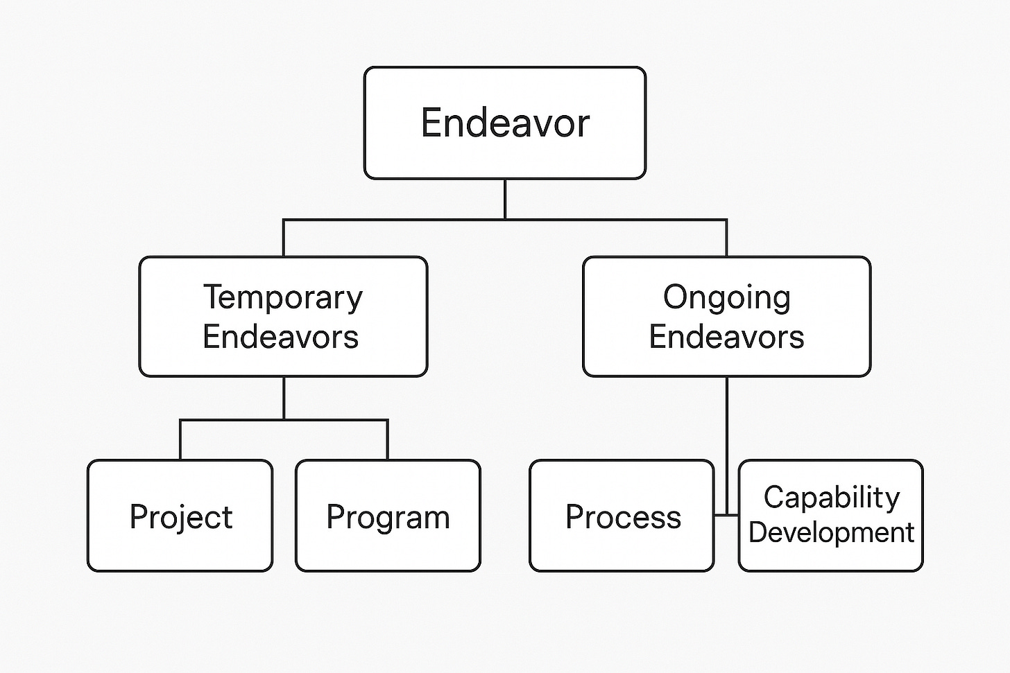 The word endeavor is an abstract concept that is often used as a broad umbrella term in the context of projects, programs, and processes, It serves as a kind of superclass that captures any purposeful, goal-oriented effort. It’s especially common in project management, where the PMBOK Guide defines a project as “a temporary endeavor undertaken to create a unique product, service, or result”. Figure 2 depicts this structure.