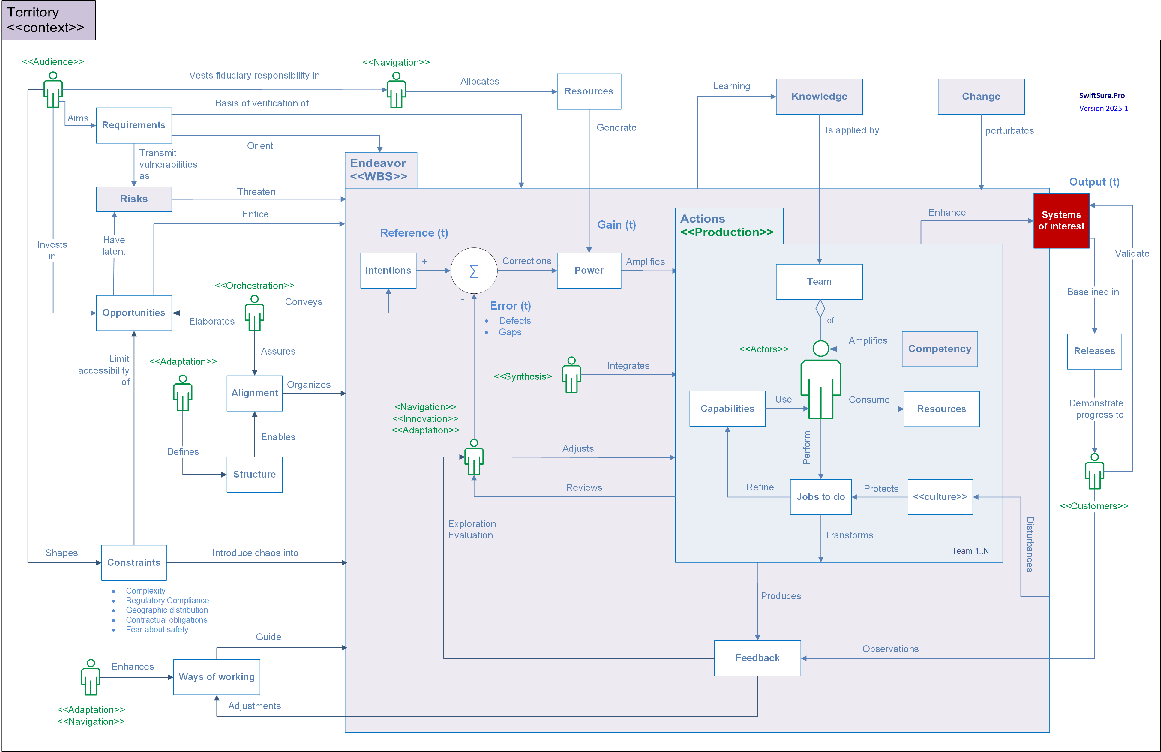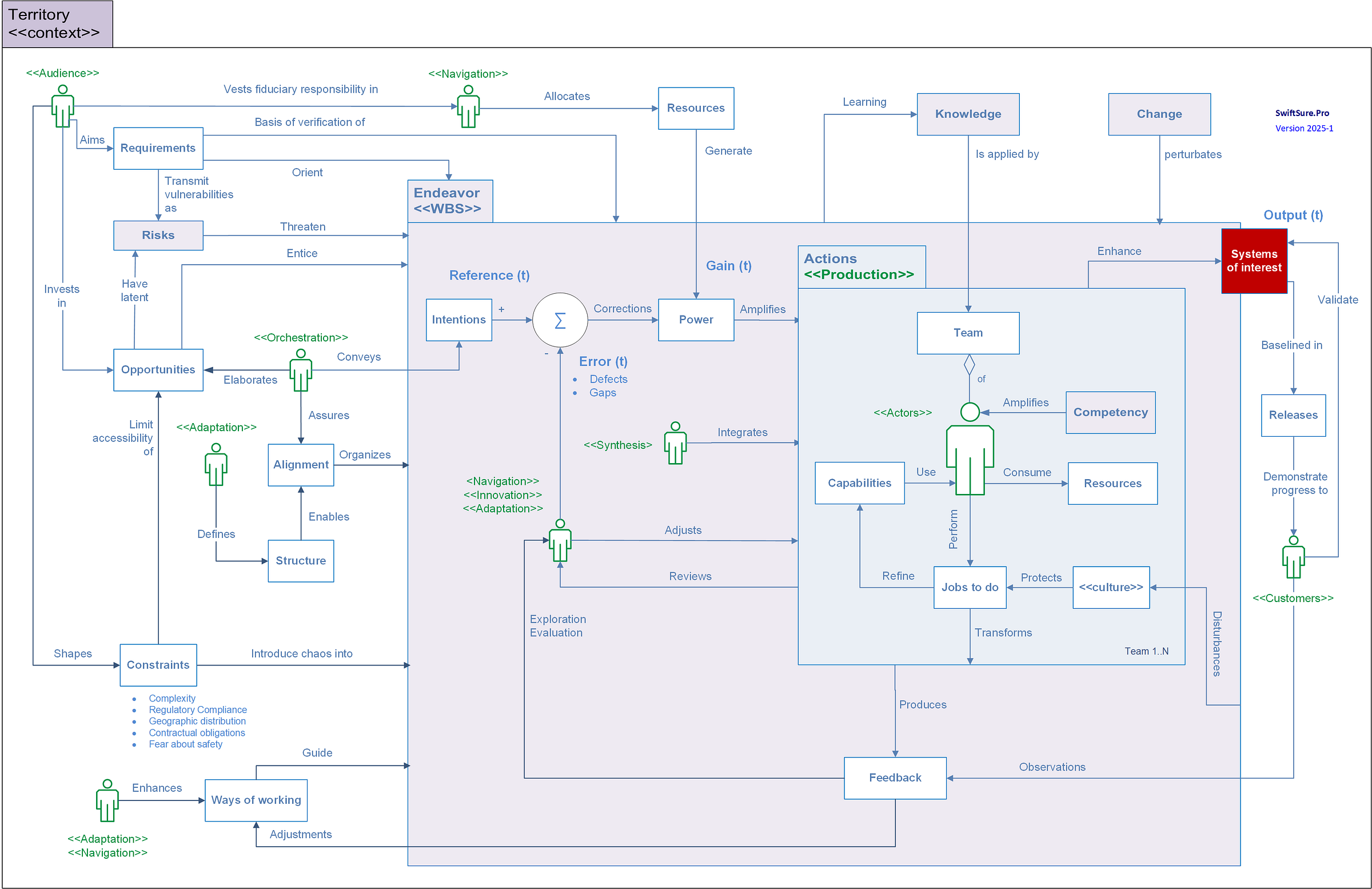 Here lies the Territory of the actions as they are performed within the context of some endeavor. Our aspirations are charted as requirements, the sacred pact we make with ourselves and our stakeholders. Our Audience, the sum of all our stakeholders, vests a Navigator role with fiduciary trust, expecting that these captured requirements will stand as the blueprint for each endeavor as it unfolds. The interactions with this Audience often shape risk profiles, priorities, and cultural dynamics.